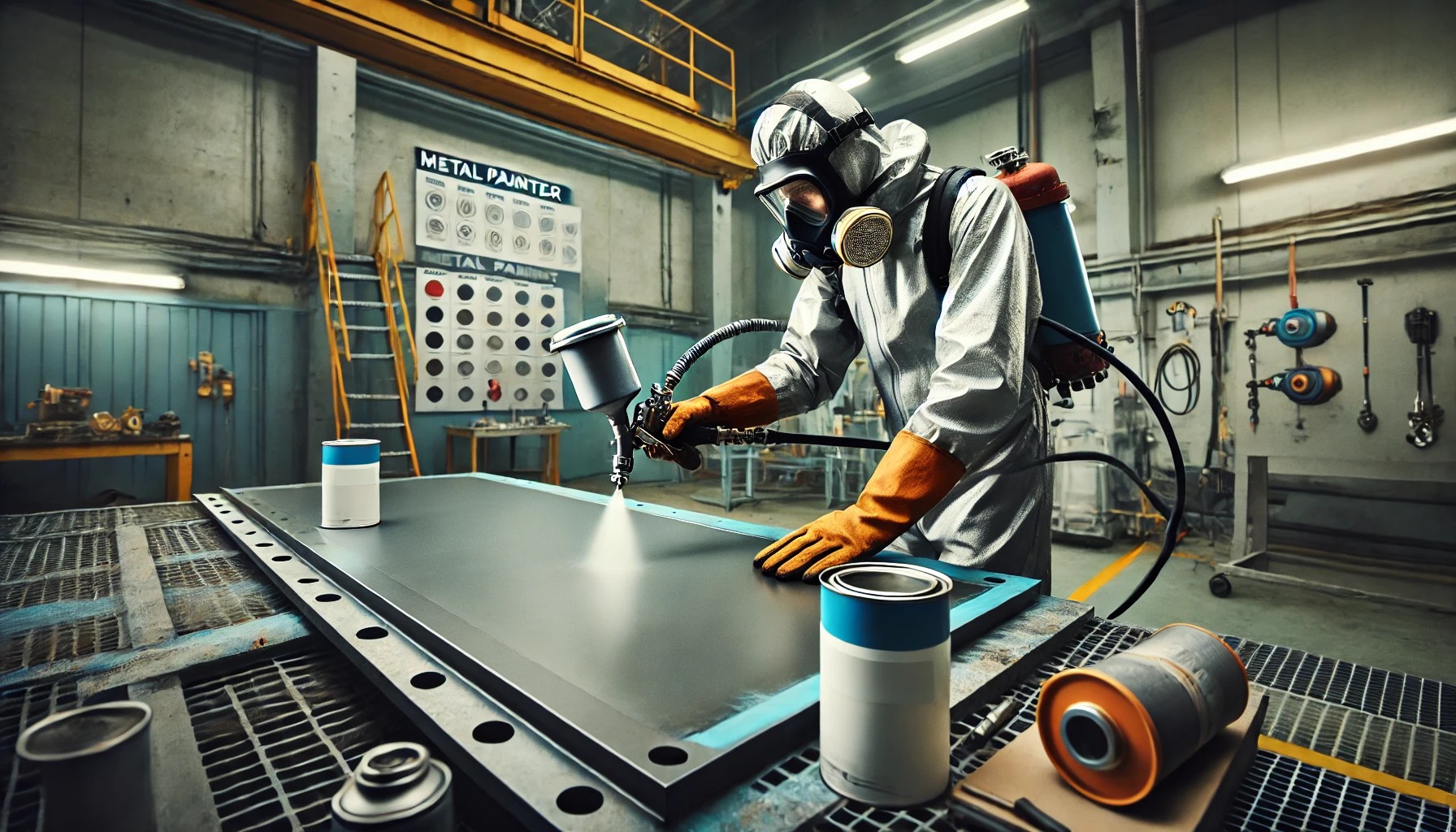 작업자는 보호장비를 착용하고, 스프레이 건을 사용해 금속 표면에 균일한 도장을 하고 있는 모습입니다. 주변에는 필요한 도구들과 작업 관련 자료가 깔끔하게 정리되어 있어 전문성과 안전성을 강조하고 있습니다.